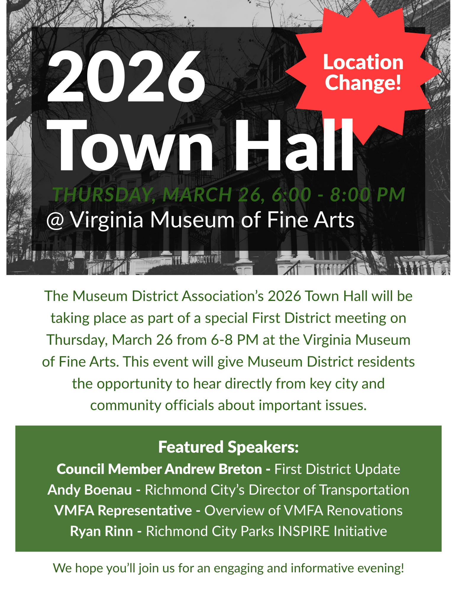 Join us on Thursday, March 20, from 6-8 PM at Richmond's First Baptist Church for our Town Hall! This event allows the Museum District Association Board of Directors to better understand what is important to Museum District residents and business owners by providing a forum for you to learn more, ask questions, and provide input.
